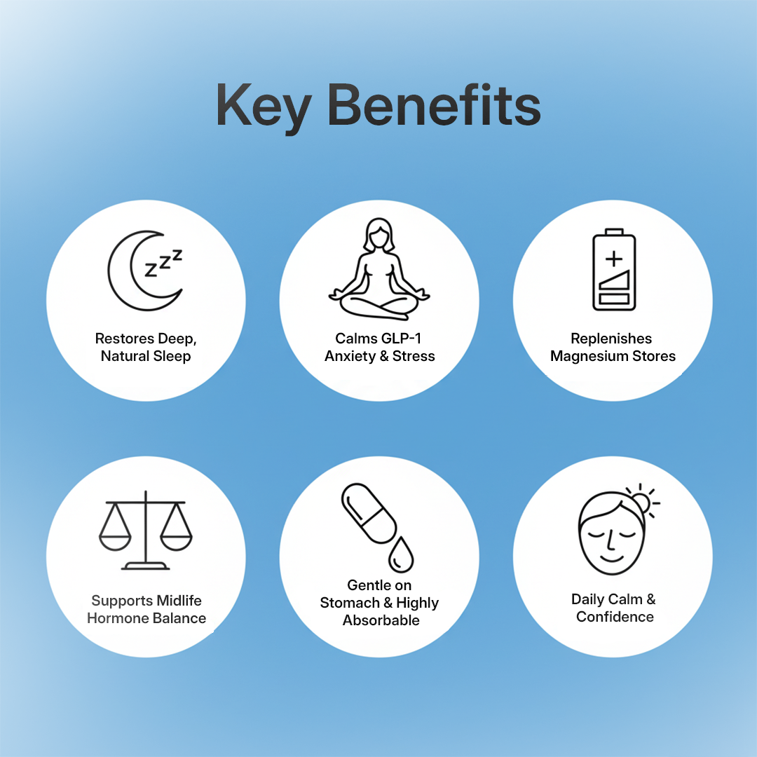 Just two capsules of Lunora CalmGlycinate™ each night help restore the magnesium your body loses through stress, hormonal shifts, and GLP-1–related nutrient depletion.